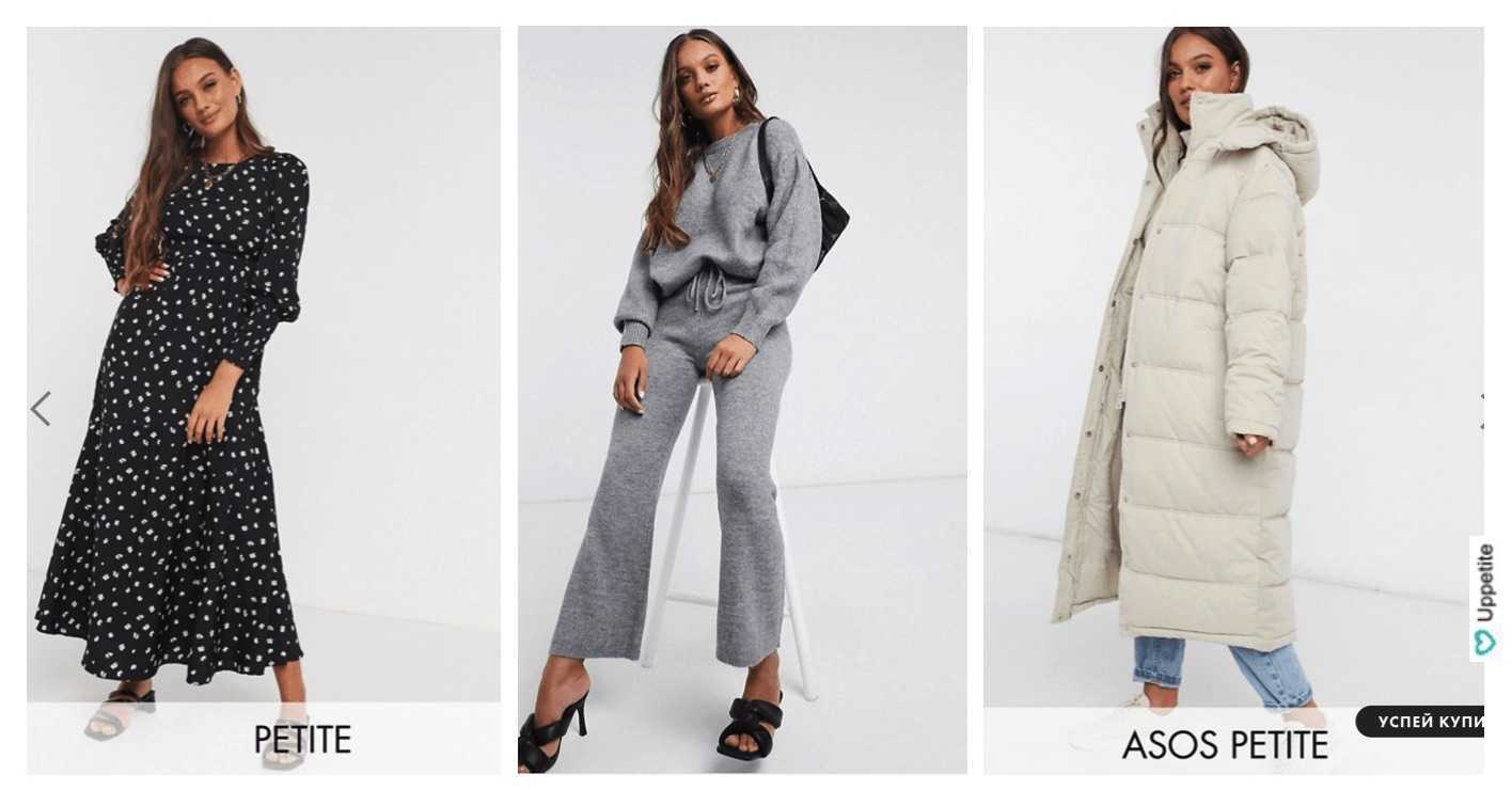 Интернет магазин для девушек маленького роста с бесплатной доставкой и возвратом. Это очень удобно, так как при заказе вы ничем не рискуете. В Asos Petite самый большой выбор вещей низкого и среднего ценового сегмента. На сайте можно найти все категории одежды от белья до пальто. Представлено огромное количество брендов. Качество тканей соответствует цене и в основном — это синтетика. Очень удобно, что Asos выделяет линейку петит в отдельную категорию и это упрощает поиск. Очень часто проводит акции и скидки, но за ними нужно обязательно следить, так как позиции разбирают практически моментально. И самое главное, у них бесплатные возвраты!