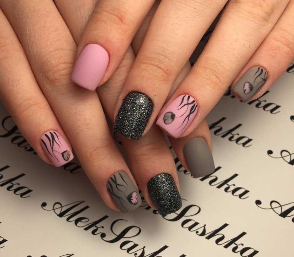 Сочетание розового с черным можно воплотить в геометрических рисунках, кружевах, объемных рисунках на ногтях. Также возможен черно-розовый френч.