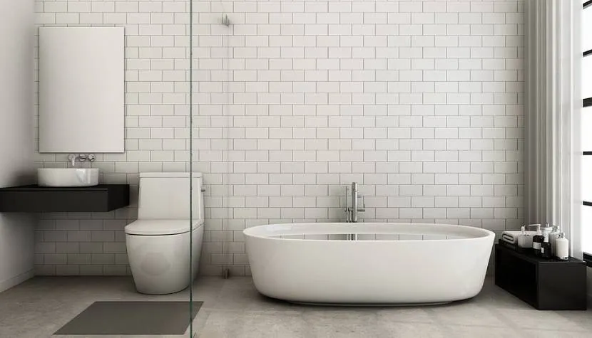 На фото ванная комната в бело-серых тонах с кирпичной стеной в зоне туалета.