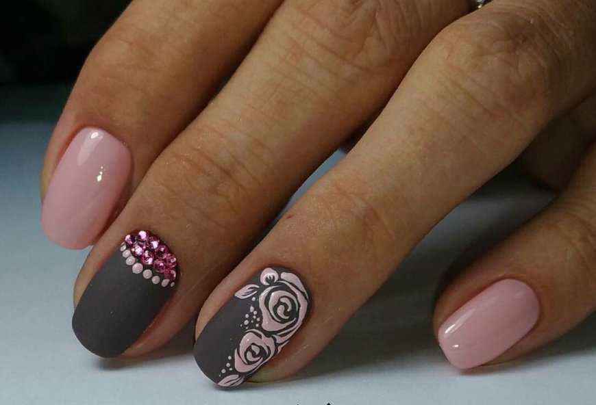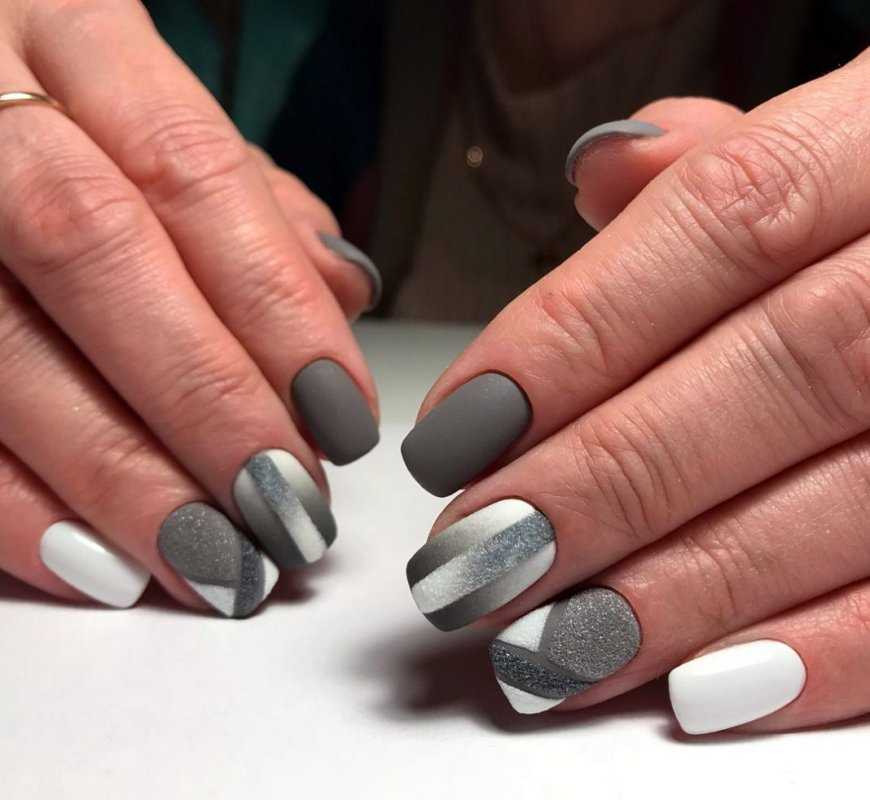 Матовый серый маникюр выглядит очень стильно и оригинально даже в чистом виде, если подобрать красивый оттенок. Часто матовый дизайн смешивают с глянцем, создавая тем самым комбинированный маникюр. А чтобы облагородить и разнообразить дизайн на серые матовые ногти наносят объемный рисунок, присыпают мерцающей пудрой или украшают бисером, блестками и стразами.