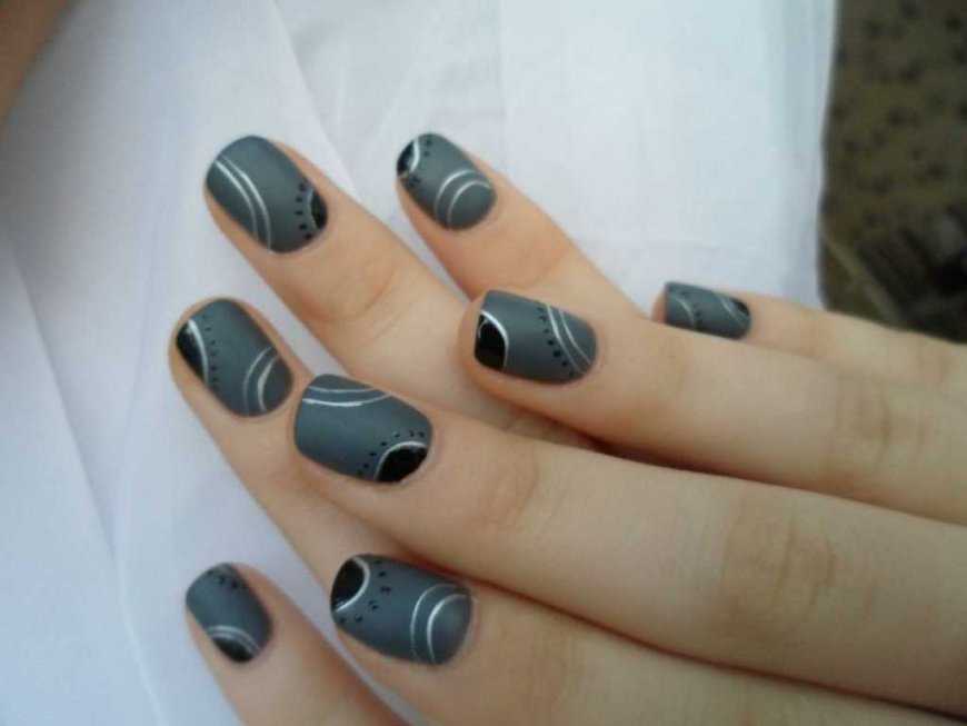 Если делать темно-серый маникюр в матовом исполнении, что на последнем этапе дизайна можно нанести на ногти кружевной прозрачный кружевной рисунок или геометрический орнамент.
