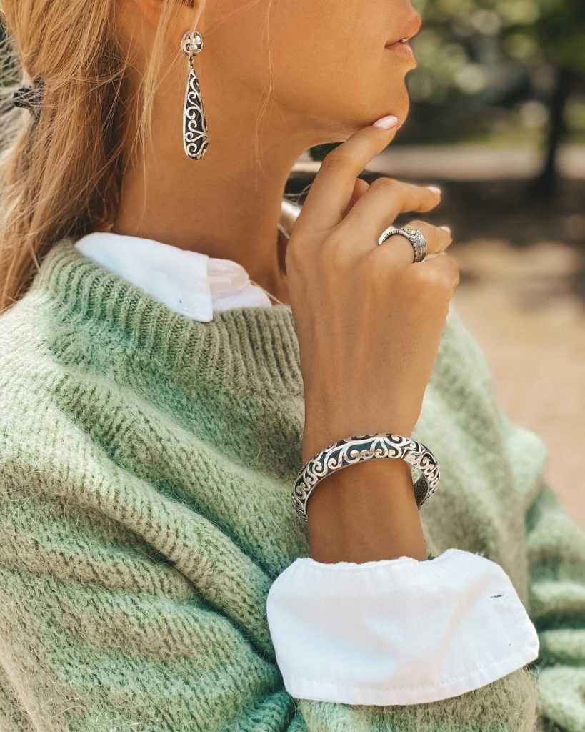 Браслет «Бугенвиллея» — объёмный, женственный, аутентичный, украшенный витиеватыми узорами, повторяющими изгибы одноимённого растения. Благодаря нашему изделию, выполненному из балийского серебра 925 пробы, вы сможете непрерывно любоваться его великолепием.