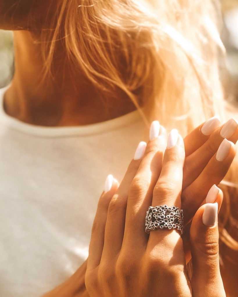 Природа — лучший источник вдохновения. Следующее украшение по имени «Морской риф» — яркое тому подтверждение. Оно состоит из большого количества маленьких трубочек из серебра, которые плотно сплетаются в неповторимый узор полотна, плотно огибающего ваш палец. Украшение является символом стойкости и решительности.
