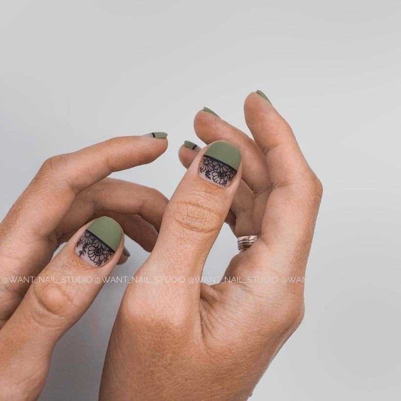 - Лидирующими станут вся зеленая цветовая гамма и цвет хаки для дизайна ногтей.