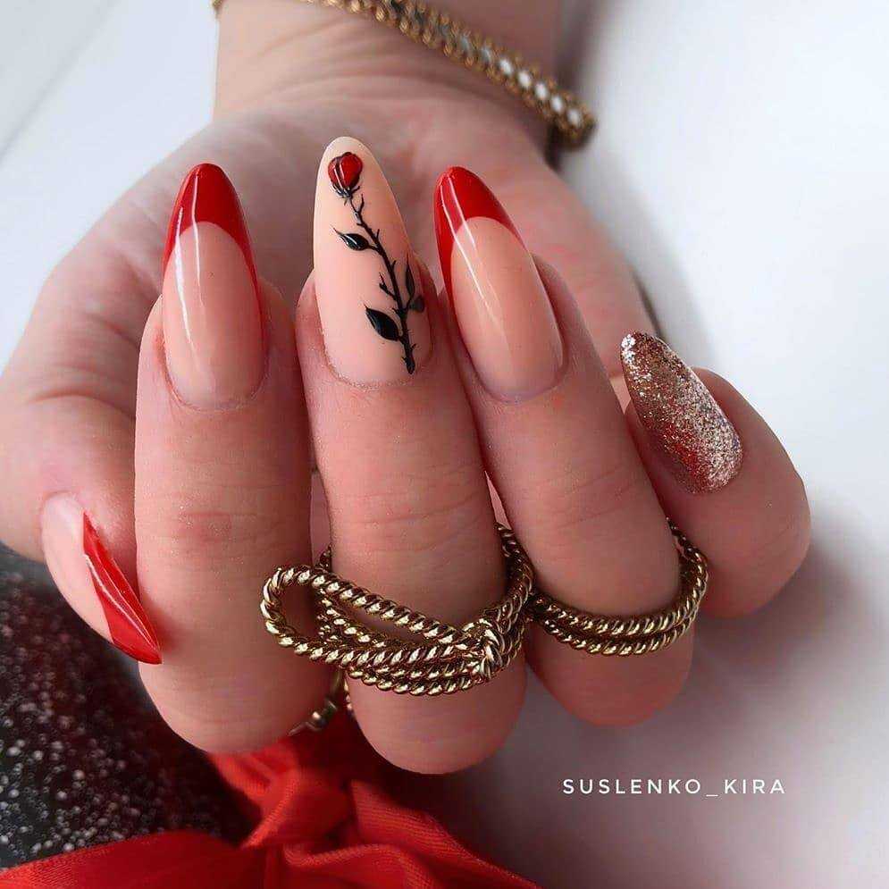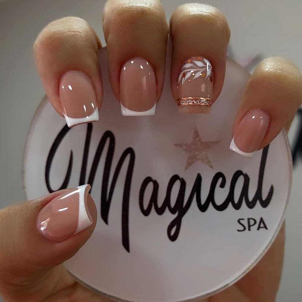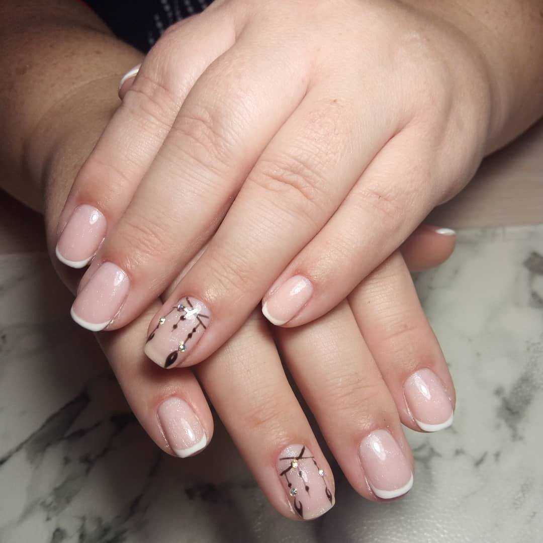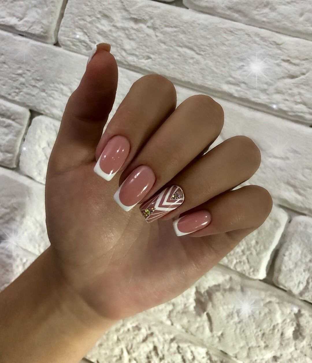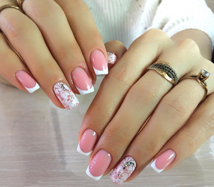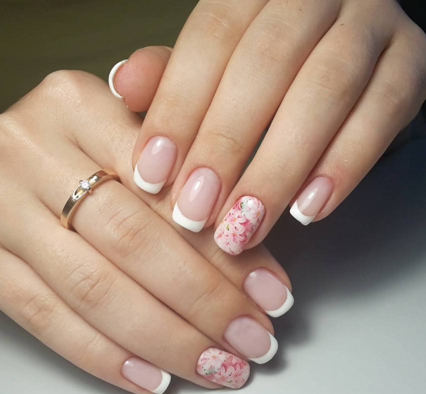 Такой дизайн ногтей можно увидеть на фото у знаменитостей. Разбавьте ваш френч цветочным принтом на нескольких пальцах, или создайте оформление с помощью геометрии. Красивый френч тогда, когда работа выполнена безупречно. Помните, что на короткие ногти полоска наносится тонкой кистью.