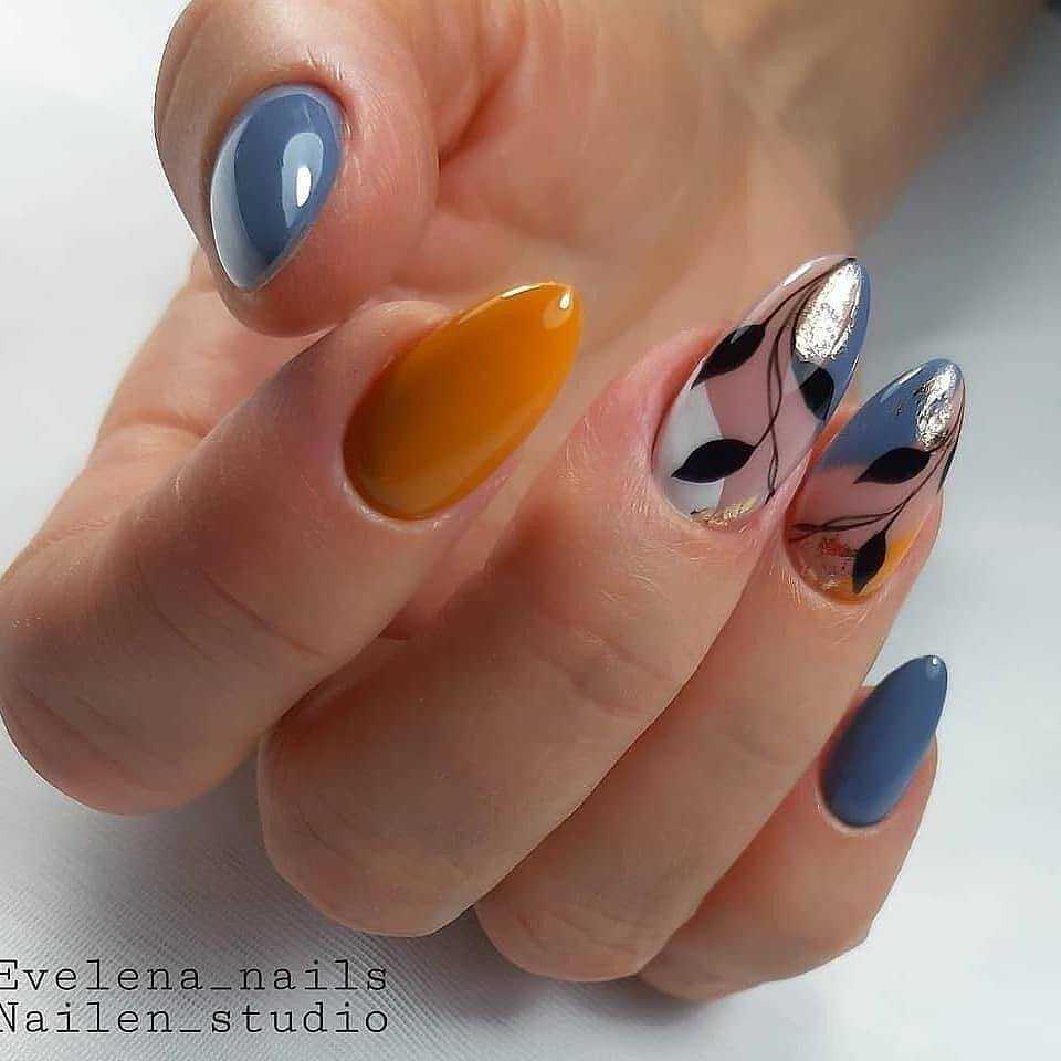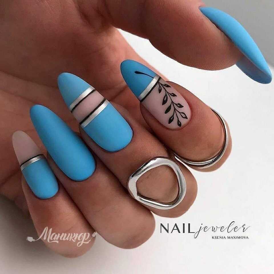 Самый глубокий цвет, комбинируется с белым тоном. Синий оригинально смотрится в маникюре с красным и чёрным. Светло-серый и синий подойдёт для будней и официальных торжеств.