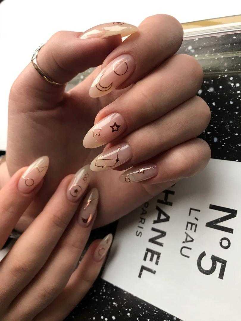 Омбре – классический вариант для девушек с отличным вкусом. Его также называют градиентом. Эта техника может быть как горизонтальной, так и вертикальной. В этом варианте модно добавить узор: луну или звезды, а также на свое усмотрение любой узор с картинки.