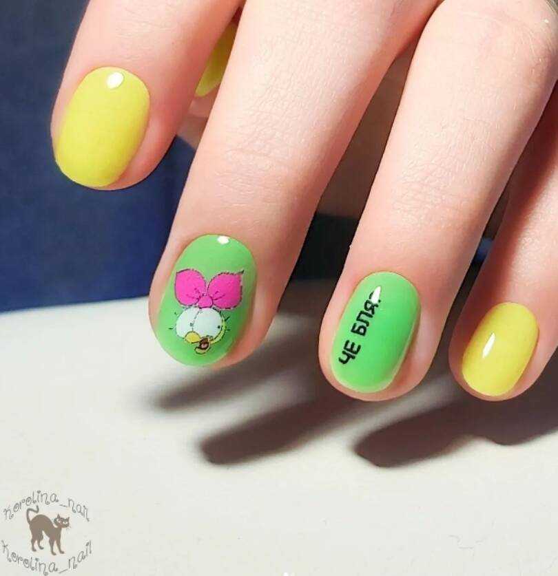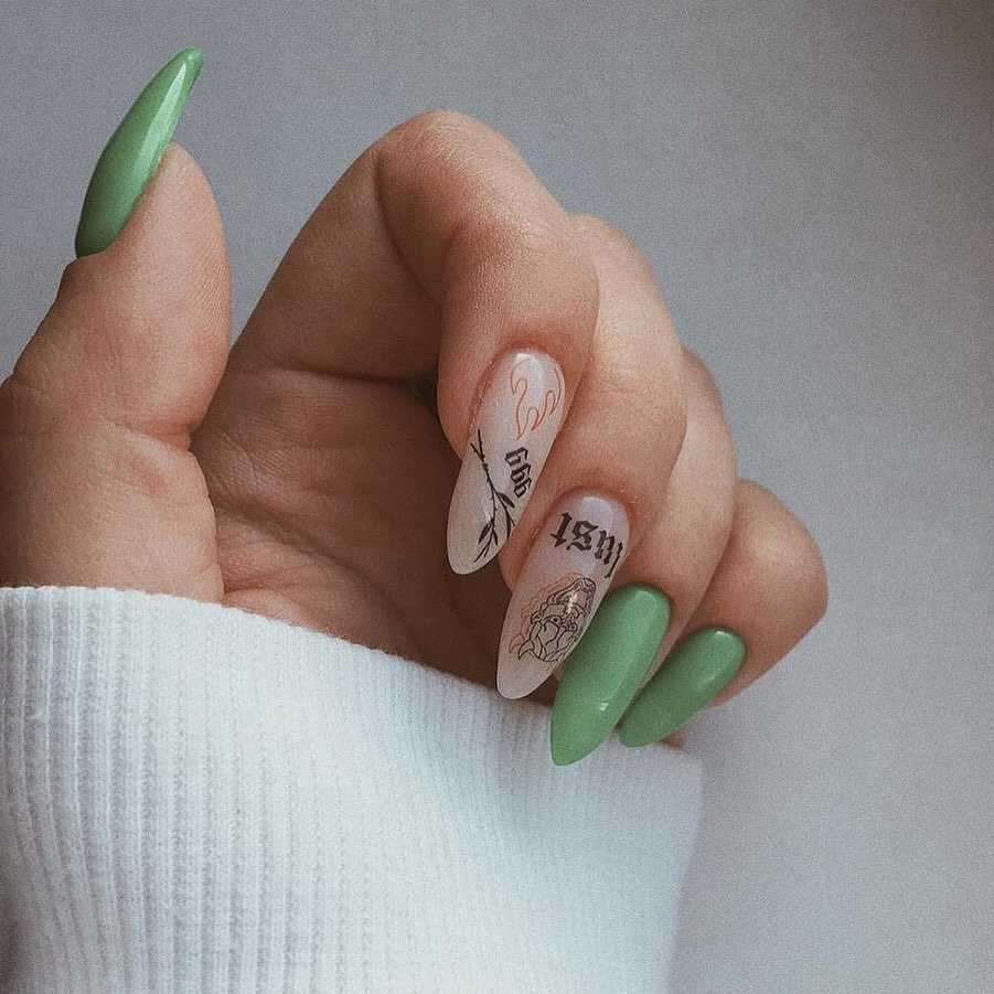 Зеленая база — хороший вариант для разного рода рисунков. Вы можете дополнить дизайн полосками в виде паутинки, завитушками или вензелями, картинками слайдерами. особенно актуален в сезоне 2022-2023 маникюр с надписями. Их можно нанести с помощью кисти или наклейки, стемпинга.