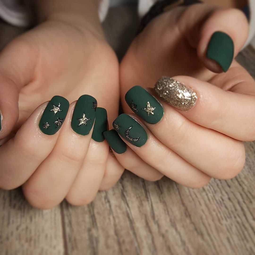В последнее время все большей популярности набирают матовые изумрудные ногти. Такое матовое покрытие может быть разных оттенков: более светлый или темный, глубокий, с синевой, металлик. Отлично смотрятся матовые изумрудные ногти с камнями или стразами на безымянных пальцах. Стразы можно использовать как в тон маникюра, так и контрастные. Также матовое покрытие можно украсить золотистой фольгой.