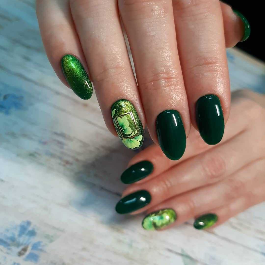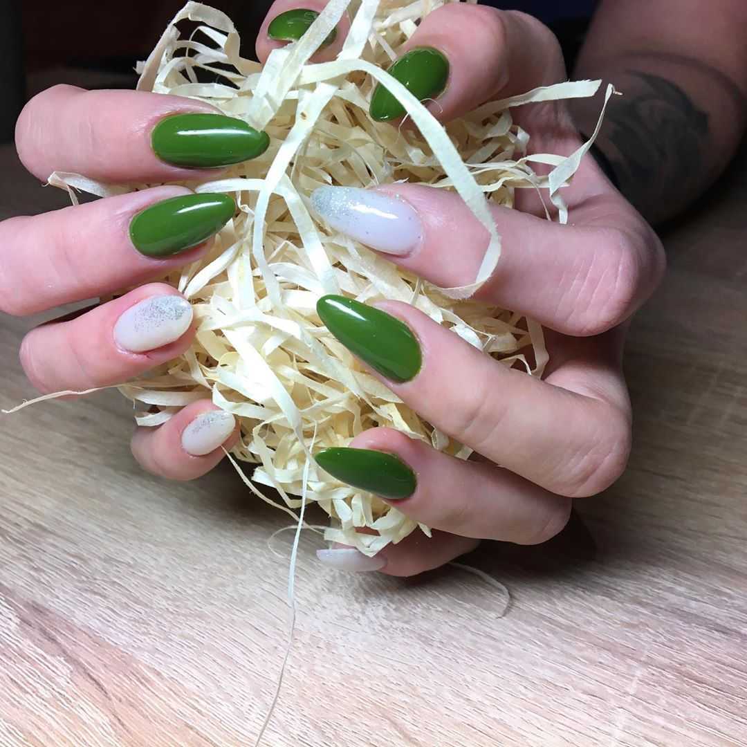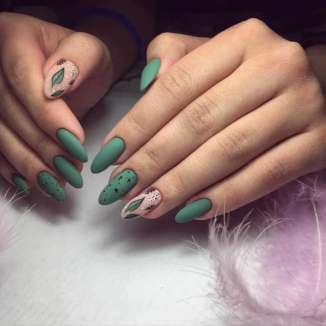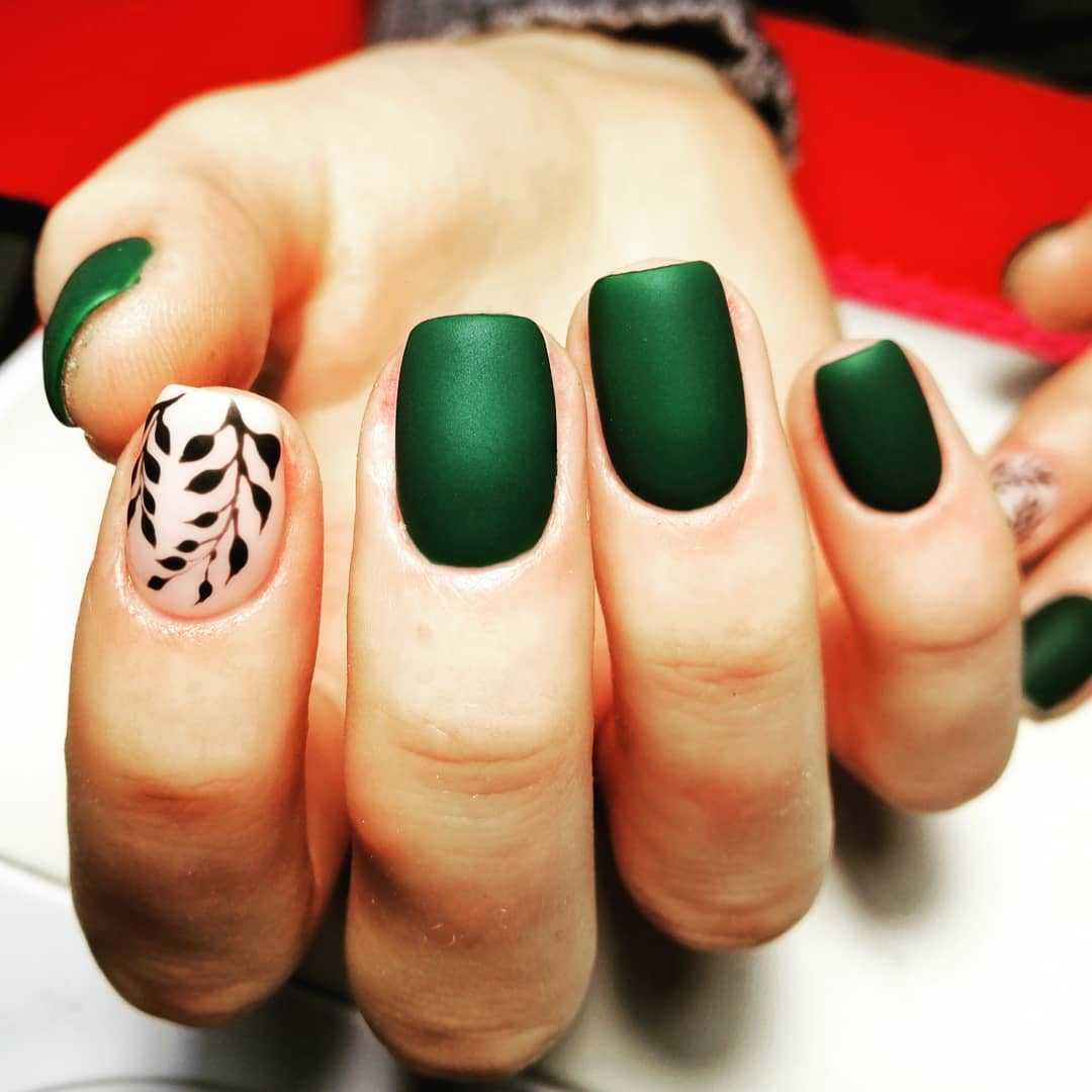 Преимущество зеленого цвета заключается в том, что он имеет огромное количество оттенков. Благодаря этому можно не только создать классический маникюр, но и комбинировать тона, а также сочетать зеленый с другими цветами. Наглядный пример представлен ниже.