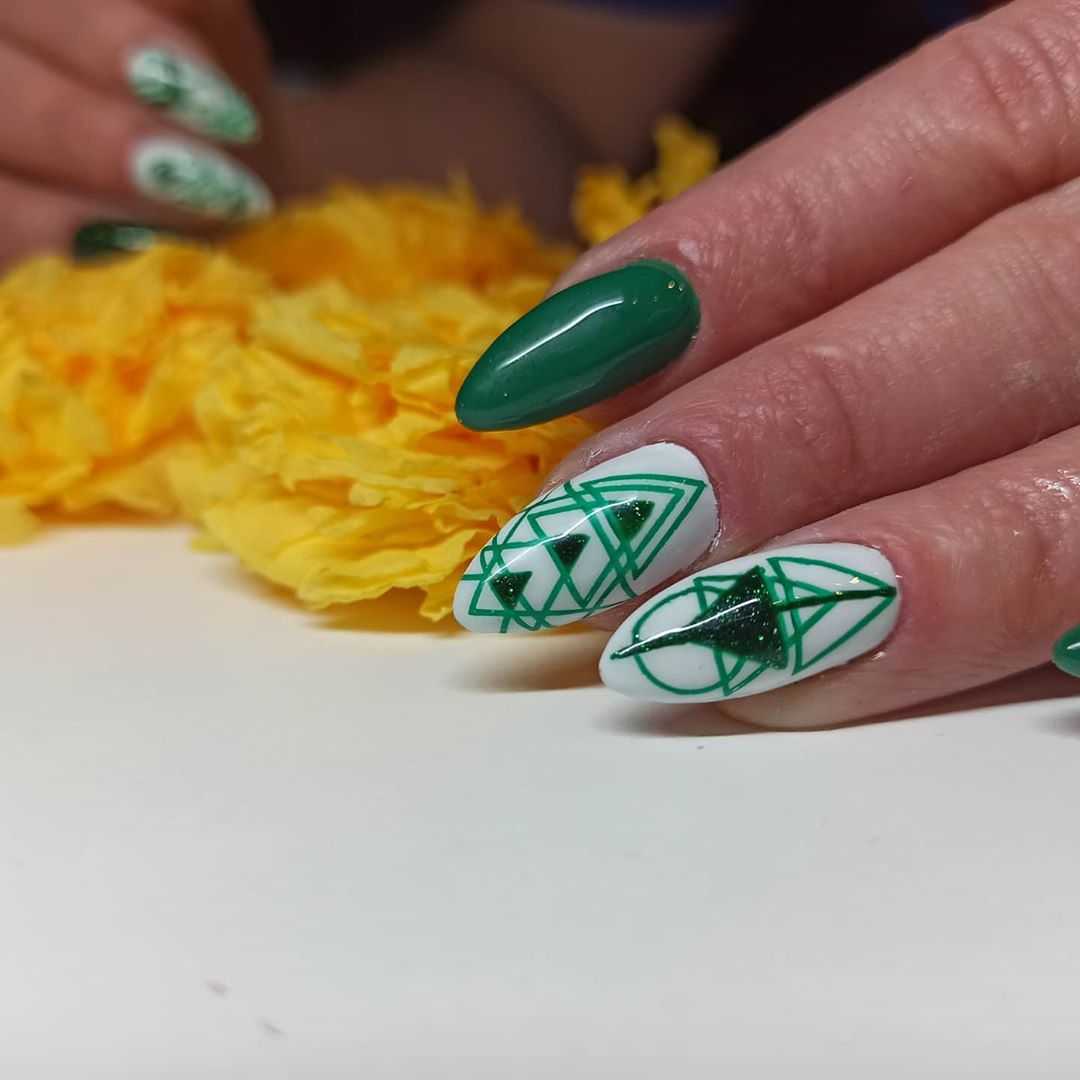 Маникюр зелёный с белым часто идёт с рисунком, и это — листья. Встречаются ландыши, оливковые ветви, папоротник, как вы увидите в моей подборке. Но чаще всего — трёхпластинчатый лист клевера. И на то есть причина. Трилистник — официальный символ праздника Дня святого Патрика — небесного покровителя Ирландии. Этот культурный и религиозный праздник отмечают ежегодно 17-го марта с XVII века католической церковью, несколькими протестантскими, а с 2017-го года и православной церковью, так как день святителя Патрикия, просветителя Ирландии, включен в месяцеслов (30 марта по новому стилю).