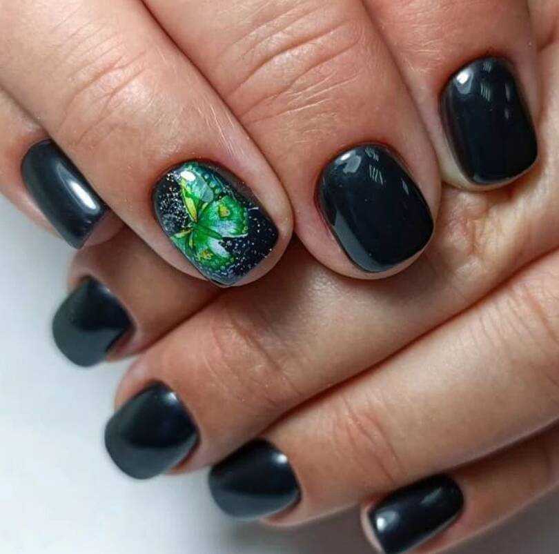 Выгодная комбинация – изумрудный и черный. С помощью данных оттенков можно создать модный и изящный маникюр. Помимо основных цветов, возможно украшение гламурными стразами, блестками золотистого оттенка.