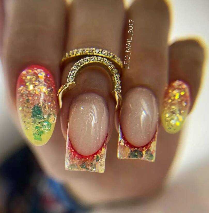 Тем дамам, которые хотят разнообразить маникюр, обязательно следует обратить внимание на зеленый маникюр с блестками. Ногти будут выглядеть очень свежо и эффектно за счет переливающегося блеска